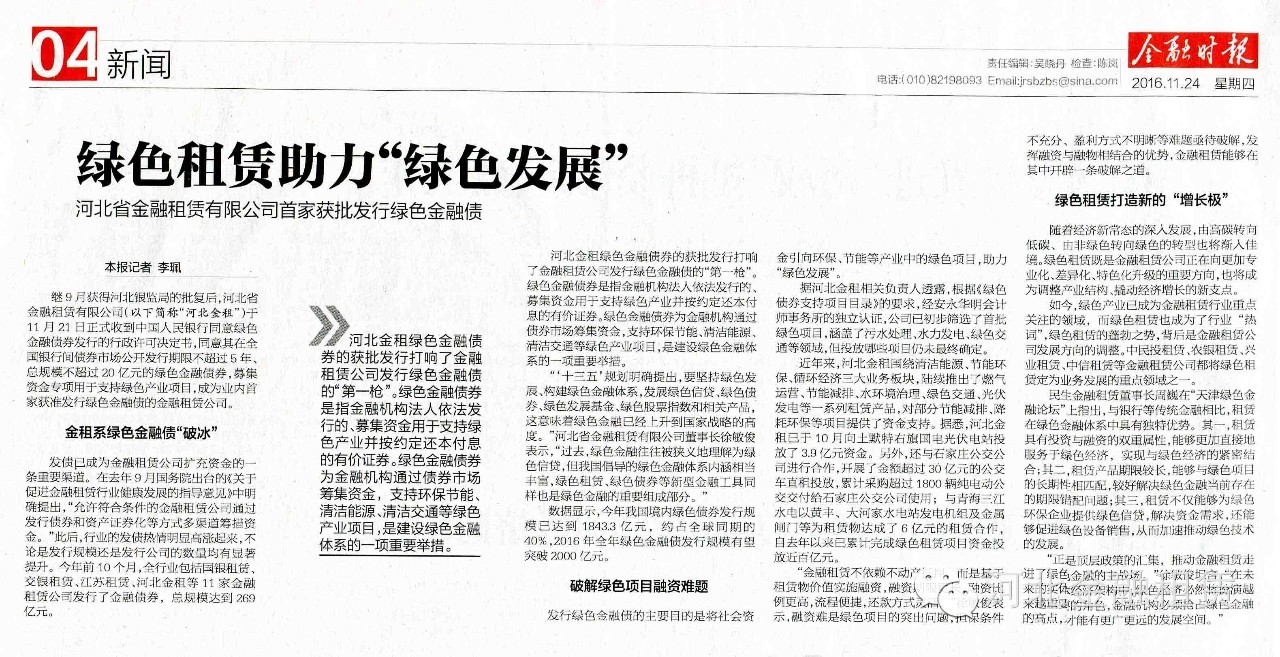 繼9月獲得河北銀監(jiān)局的批復(fù)后,河北省金融租賃有限公司(以下簡稱“河北金租”)于11月21日正式收到中國人民銀行同意綠色金融債券發(fā)行的行政許可決定書,同意其在全國銀行間債券市場公開發(fā)行期限不超過5年、總規(guī)模不超過20億元的綠色金融債券,募集資金專項用于支持綠色產(chǎn)業(yè)項目,成為業(yè)內(nèi)首家獲準發(fā)行綠色金融債的金融租賃公司。