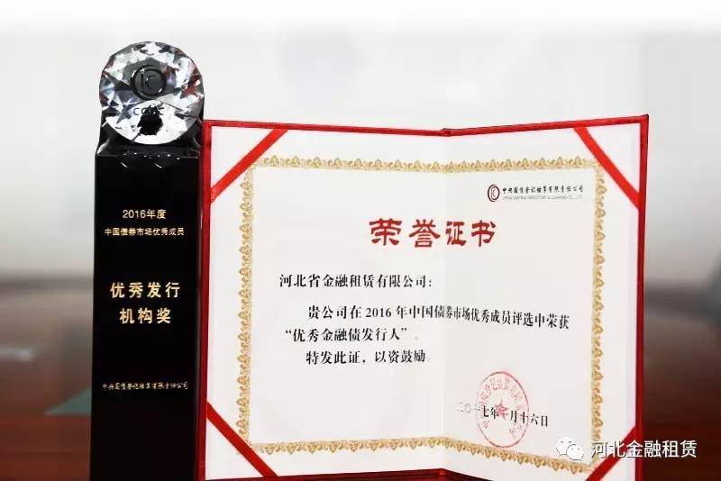 日前,中央國債登記結(jié)算有限責(zé)任公司發(fā)布2016年度中國債券市場優(yōu)秀成員評選結(jié)果,河北省金融租賃有限公司被評為“2016年度全國金融債優(yōu)秀發(fā)行人”,進(jìn)一步彰顯了河北金租的品牌和市場影響力。