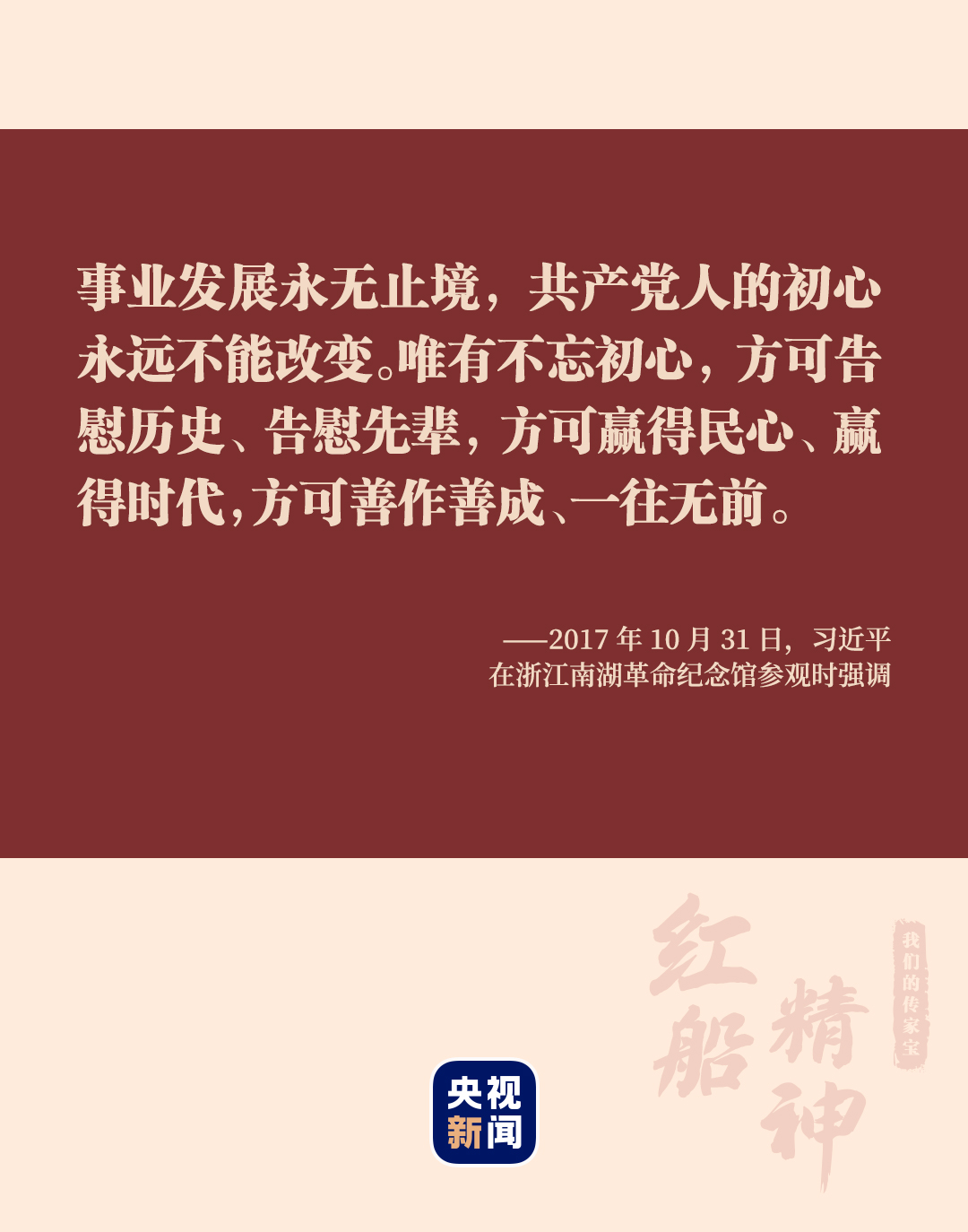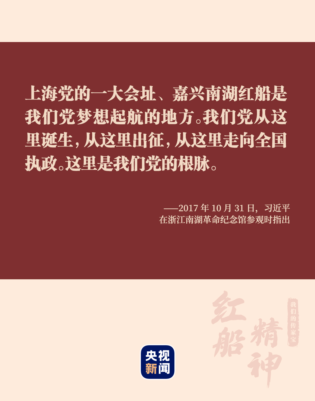 “小小紅船承載千鈞,播下了中國革命的火種,開啟了中國共產黨的跨世紀航程。”2017年10月31日,黨的十九大勝利閉幕僅一周,習近平總書記帶領中共中央政治局常委專程趕赴嘉興南湖瞻仰紅船。