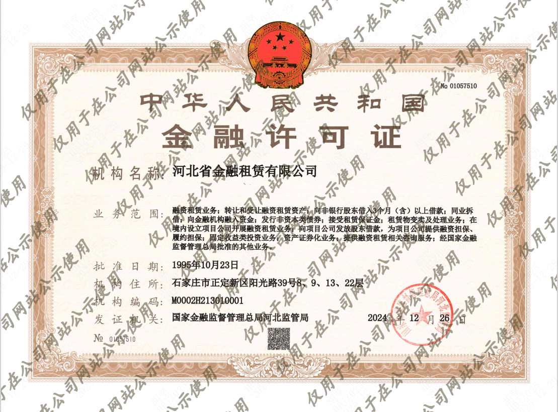 根據《國家金融監督管理總局辦公室關于加強銀行保險機構許可證管理的通知》(金辦便函〔2023〕515號)文件要求,河北省金融租賃有限公司于2024年12月26日換領新《中華人民共和國金融許可證》,現予以公示。